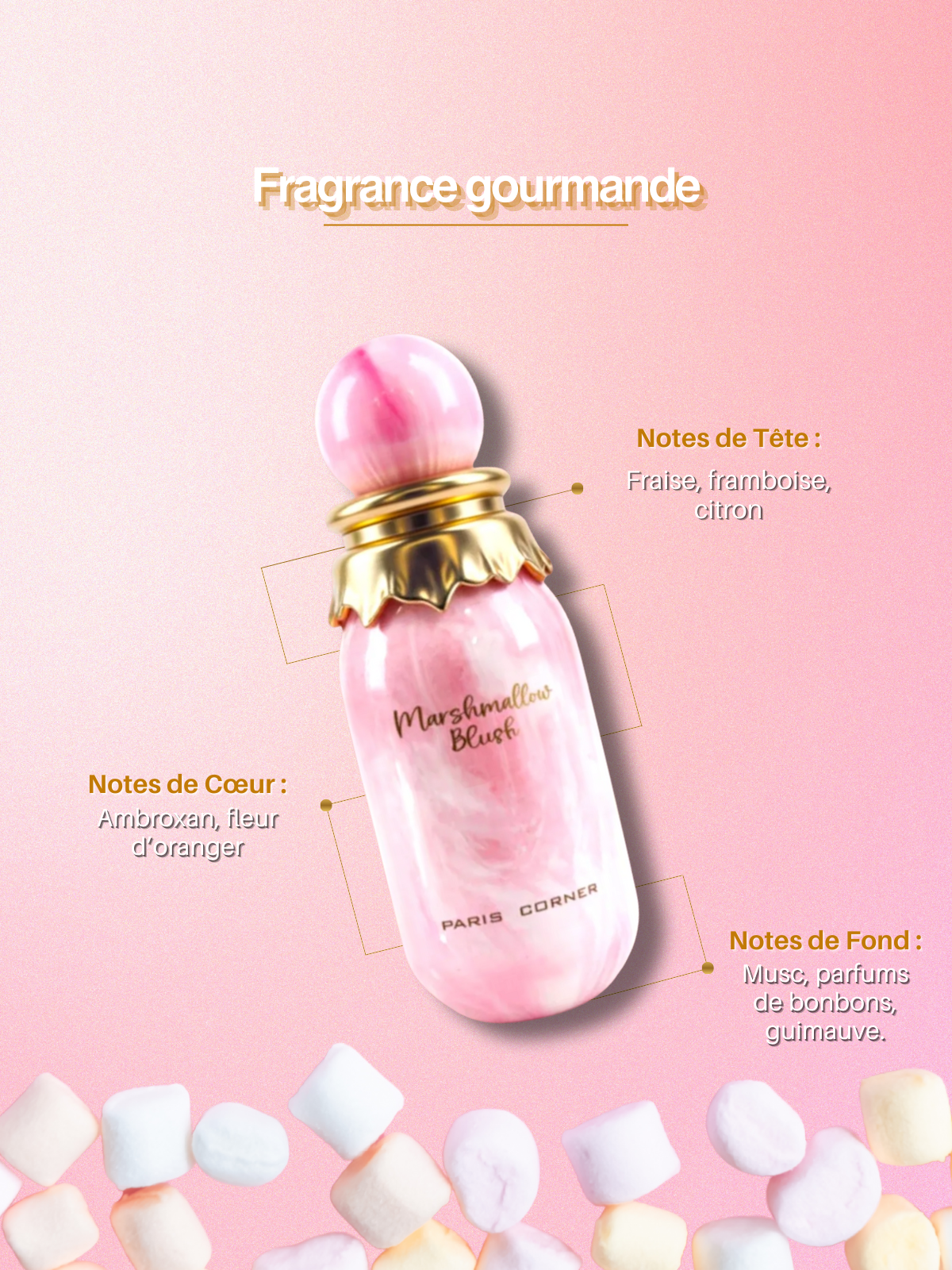 Marshmallow Blush – Paris Corner séduit par son équilibre parfait entre gourmandise, fruité et élégance, pour une fragrance légère, raffinée et irrésistiblement addictive.